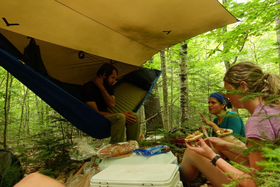 Me, Spirit, Sin and Tomato got on the early shuttle back to trail the next day. It was a full day of flat walking, otherwise unheard of for Maine. A north bounder set up a trail magic station with drinks, food, snacks, fruit and a bunch of other goodies. Thanks for that Conan!