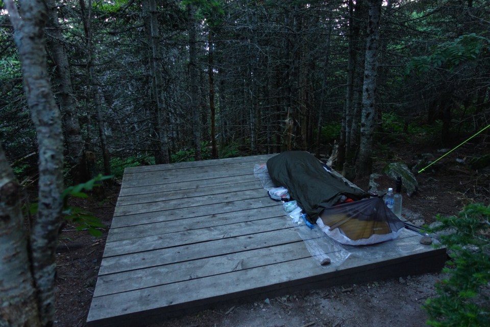 That evening I met a group of overnight hiker who offered us dinner and company. We sat there, exchanging stories as the sun set. The campground is located between two peaks, and tents are set up on wooden platforms. It felt as if we were camping in the sky. Me and Spirit decided to try to get up at 4am the next morning to catch the sunrise on top of Bigelow West Peak.
