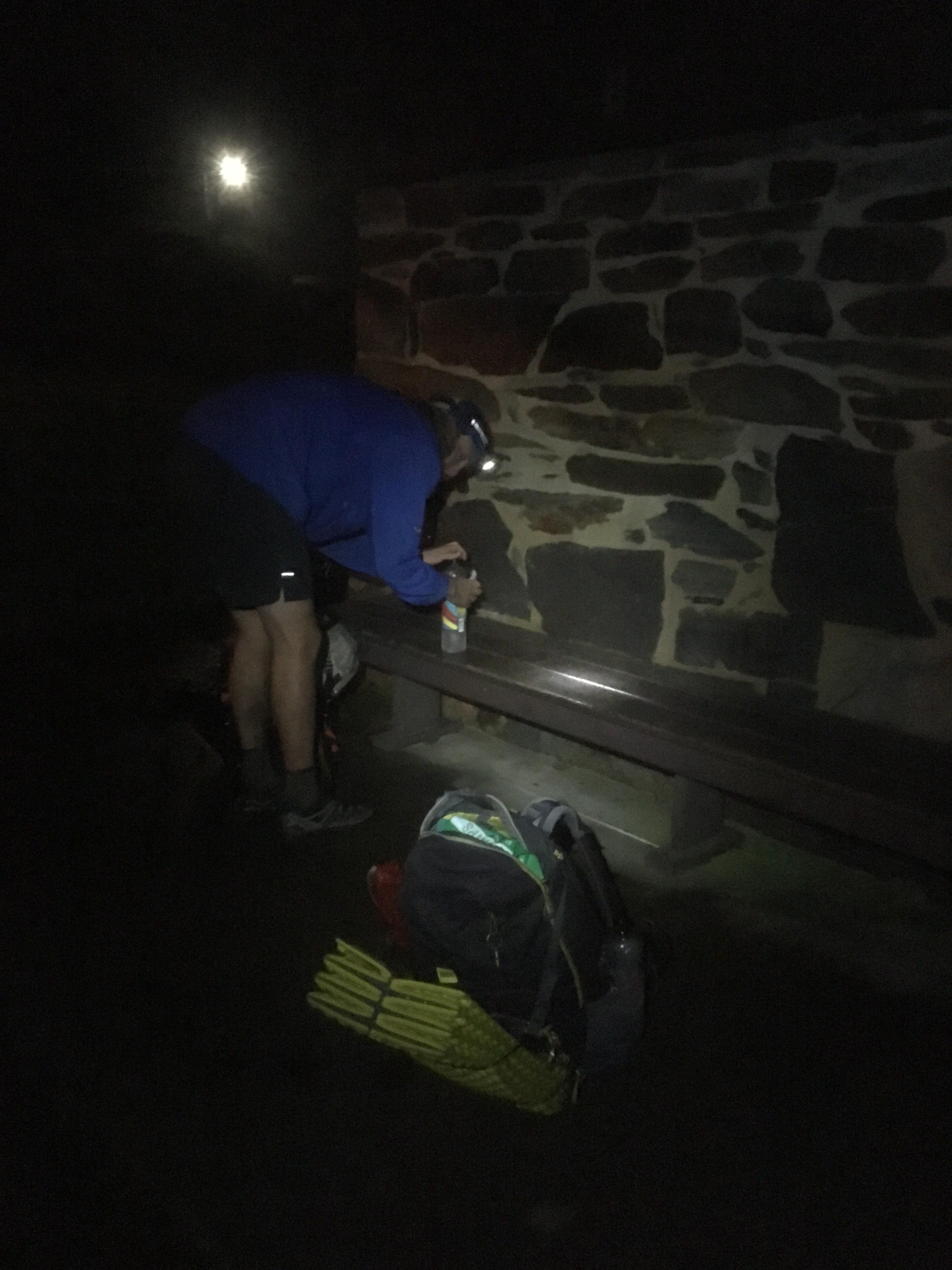 After snacking, breaking, and taping feet for about 25 minutes we started walking again, this time with headlamps on. Both Spirit’s and Sun Chaser’s headlamps were insufficient, however, so we more or less relied on mine. We all felt pretty good at 8 pm with less than 20 miles to go. As nightfall emerged, the walking got significantly slower.