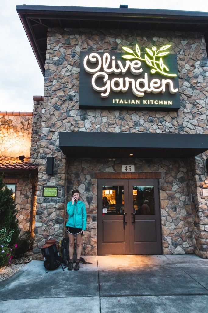 We waited for Spirit’s mom (if you’re reading this, I’m sorry, but I really can’t remember your name!) outside Olive Garden. Although a chain, it’s still a little too fancy for a hiker who has yet to shower.